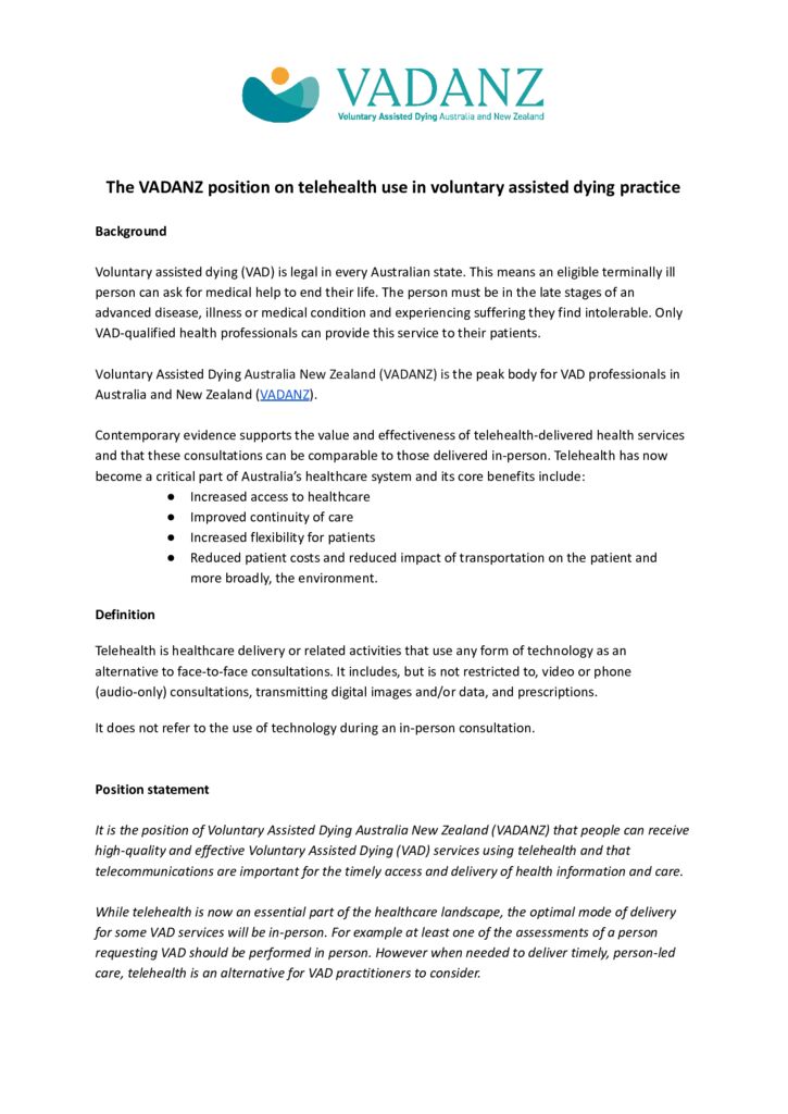 VADANZ position on telehealth use in voluntary assisted dying practice